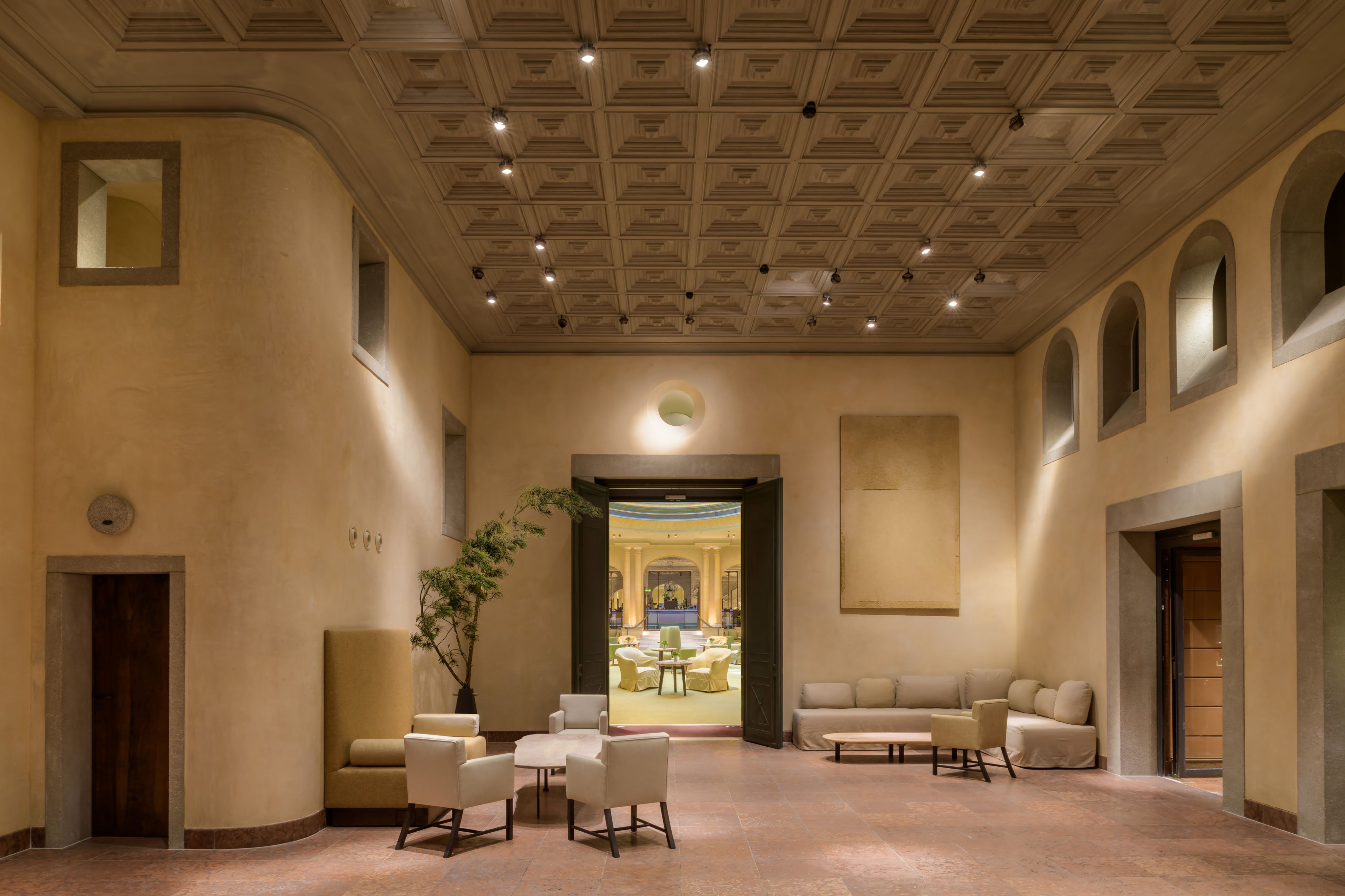 Der Plan für die Eingangshalle und Rezeption entwickelte Vervoordt gemeinsam mit dem japanischen Architekten Tasuro Miki. Sie orientierten sich an den ursprünglichen Proportionen des 1841 erbauten und 1944 weitgehend zerstörten Hauses am Promenadeplatz. Die Balustrade ließen sie zurückbauen und ersetzten sie durch Wände mit Öffnungen. Der Natursteinboden wurde bewusst erhalten, aber mit Stein aus dem letzten noch aktiven Natursteinbruch Ungarns ergänzt und erweitert. „Ungarisch Rot“ heißt der Farbton, der früher vor allem in feudalen und kirchlichen Prachtbauten Österreichs und Süddeutschlands verwendet wurde. Die neu eingefügte Kassettendecke schließt nach oben hin ab.