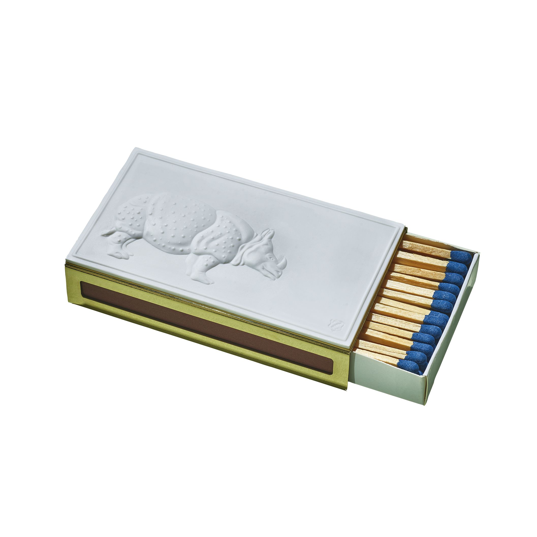 Ein Sammlerhighlight für alle, die traditionsbewusst und zugleich immer eine Nasenlänge voraus sind. Die Königliche Porzellan Manufaktur Nymphenburg hat mit der Wiener Werkstätte Carl Auböck ein Design-Feuer entfacht: Ein Streichholzetui aus Messing, das eine Porzellan-Plakette mit dem Relief der Nashorndame Clara ziert, jener knuffigen und lang geliebten Ikone aus dem Hause Nymphenburg.